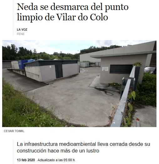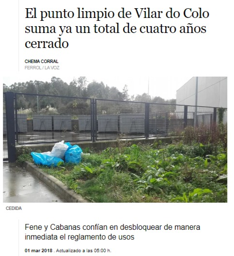 Os 27.000 veciños dos concellos da penísula de Bezoucos seguen agardando 16 anos despois pola apertura das instalacións do Punto Limpo de Vilar do Colo. Neste momento, Fene deberá licitar a xestión para dar servizo á veciñanza.