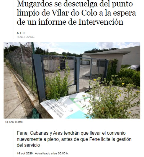 A licitación non chega ata novembro de 2021 (https://www.lavozdegalicia.es/noticia/ferrol/fene/2021/11/09/punto-limpio-poligono-vilar-do-colo-dara-servicio-25-horas-semanales/0003_202111F9C5993.htm) e queda deserta en decembro porque ningunha empresa reunía os requisitos para contratar. Foi en xaneiro de 2022 cando Ares, Cabanas e Fene incrementaron en case 66.000 euros a contía da licitación (https://www.diariodeferrol.com/articulo/comarcas/fene-licita-nuevo-gestion-punto-limpio-vilar-do-colo-3416831). Non é ata agosto de 2022 que se publica a licitación na plataforma de contratación do Estado (https://contrataciondelestado.es/wps/poc?uri=deeplink%3Adetalle_licitacion&idEvl=6rS2kmU291znSoTX3z%2F7wA%3D%3D) e finalmente novembro de 2022 cando se realiza a adxudicación.